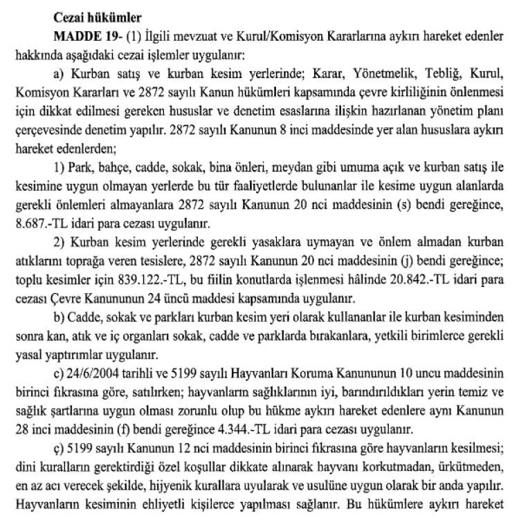 Hayvan refahına aykırı davranışlar, çevre kirliliği ve uygunsuz kesimler için idari para cezalarının da belirlendiği tebliğe göre örneğin, uygun olmayan yerlerde kesim yapanlara 8.687 TL’den başlayan cezalar uygulanırken, daha ağır ihlallerde hayvan başına veya tesis bazında yüksek tutarlı yaptırımlar öngörüldü.
