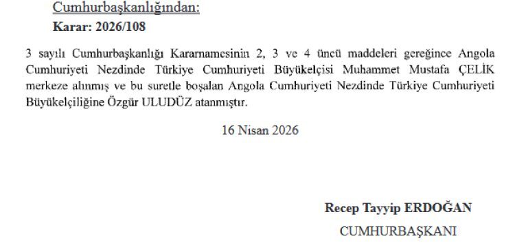 Bugünkü Resmi Gazete’de yayımlanan karara göre Türkiye’nin Gine Bissau, Macaristan, Nijer, Malezya, İsveç, Madagaskar ve Angola büyükelçiliklerine yeni atamalar yapılırken, bazı isimler de merkeze çekildi.