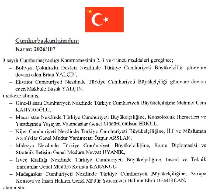 Kararla birlikte Türkiye’nin 7 ülkedeki büyükelçilik görevlerine yeni isimler getirildi. Buna göre, Gine Bissau Büyükelçiliğine Mehmet Cem Kahyaoğlu, Macaristan Büyükelçiliğine Dışişleri Bakanlığı Konsolosluk Hizmetleri ve Yurtdışında Yaşayan Vatandaşlar Genel Müdürü Gülsun Erkul atandı.