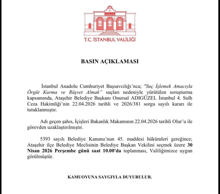 Öte yandan, 5393 sayılı Belediye Kanunu’nun 45. maddesi gereğince Ataşehir Belediye Meclisi’nin belediye başkan vekilini seçmek üzere 30 Nisan 2026 Perşembe günü saat 10.00’da toplanmasının Valilik tarafından uygun görüldüğü bildirildi.