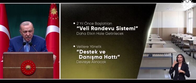 Okul ve veli arasındaki iletişimi güçlendirmek için 2 yıl önce başlattığımız ‘Veli Randevu Sistemini’ daha etkin hale getireceklerini ifade eden Cumhurbaşkanı Erdoğan, “Dijital bağımlılıkla mücadele kapsamında, velilerimize yönelik ‘destek ve danışma hattını’ kısa süre içinde devreye alacağız. Öğretmenlerimize ve okul yöneticilerimize ‘Kriz Yönetimi ve Sınıf İçi Müdahale’ eğitimleri vereceğiz. Öğrencilerimiz için psiko-sosyal destek mekanizmalarını güçlendirecek; ‘Duygu-Değer Temelli Dijital Esenlik’ çalışmalarını yaygınlaştıracağız” diye konuştu.
