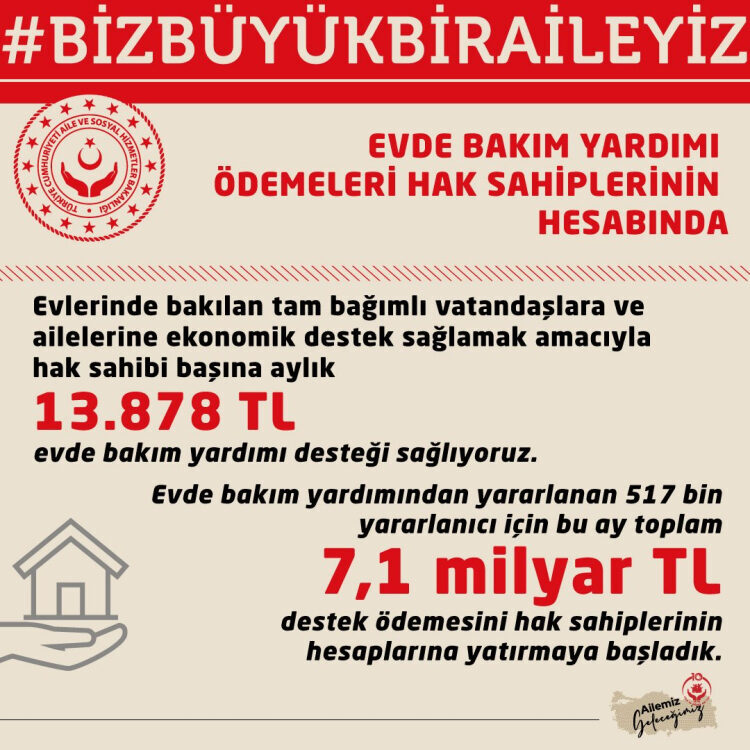 Engelli vatandaşların aile bütünlüklerini koruyarak evde bakım hizmeti almalarını öncelikli gördüklerini ifade eden Bakan Göktaş, “Bu yardım ile engellilerin yaşadığı ortamdan ayrılmadan, ailesi veya yakınlarıyla birlikte yaşayarak aile birliğinin korunmasına ve güçlenmesine destek oluyoruz.” dedi. Evde Bakım Yardımı kapsamında 2026 yılı Ocak-Temmuz döneminde hak sahibi başına aylık 13 bin 878 lira ödeme yapıldığını hatırlatan Bakan Göktaş, “Evlerinde bakılan tam bağımlı vatandaşlar ve aileleri için bu ay toplam 7,1 milyar lira Evde Bakım Yardımı’nı hesaplara yatırmaya başladık. Hali hazırda 517 bin vatandaşımız Evde Bakım Yardımı’ndan yararlanıyor. Ödemelerin tüm engelli vatandaşlarımıza ve ailelerine hayırlı olmasını diliyorum.” dedi.