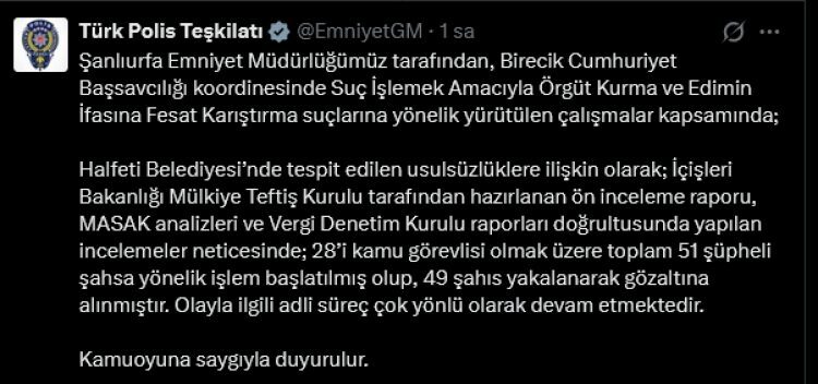 ANKARA (İGFA) – Şanlıurfa’da Halfeti Belediyesi’ne yönelik yürütülen soruşturma kapsamında geniş çaplı bir operasyon gerçekleştirildi.