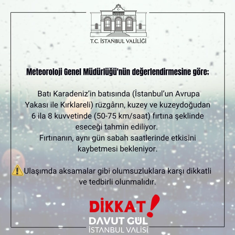 İstanbul’un Avrupa Yakası ve Kırklareli açıklarında rüzgârın 75 km/s hıza ulaşması bekleniyor. Yetkililer, ulaşımda aksamalara karşı uyardı.