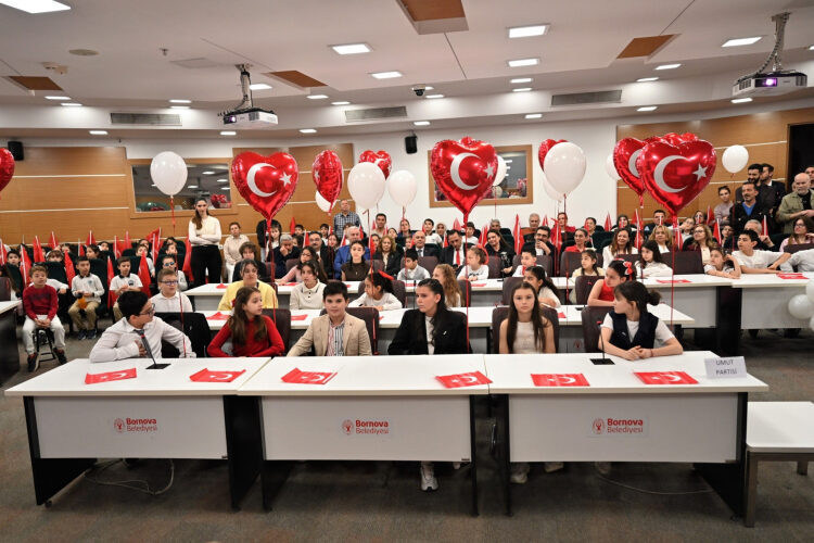 İZMİR (İGFA) – Bornova Belediyesi Meclis Salonu, “Söz çocuklarda” sloganıyla gerçekleştirilen 2. Bornova Çocuk Meclisi’ne ev sahipliği yaptı. Türk bayrakları ve kırmızı-beyaz balonlarla süslenen salonda etkinlik, Kahramanmaraş ve Şanlıurfa’da yaşanan saldırılarda hayatını kaybeden öğrenci ve öğretmenler için yapılan saygı duruşu ve ardından okunan İstiklal Marşı ile başladı.