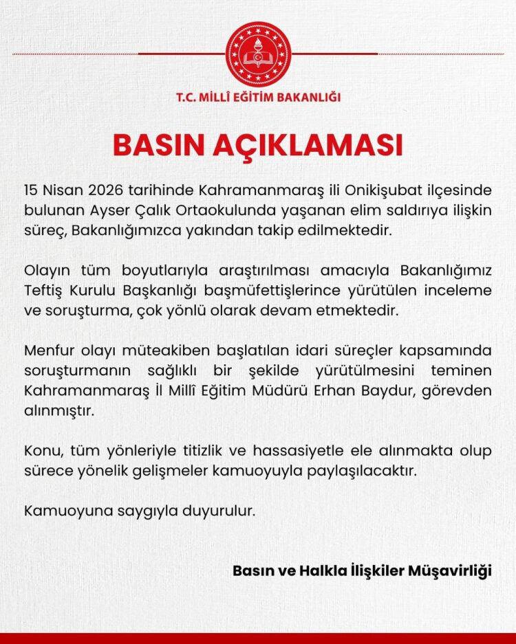 ANKARA (İGFA) – Milli Eğitim Bakanlığı, 15 Nisan 2026’da Kahramanmaraş’ın Onikişubat ilçesindeki Ayser Çalık Ortaokulu’nda yaşanan saldırıya ilişkin açıklama yaptı. Bakanlık, olayın tüm boyutlarıyla incelenmesi için Teftiş Kurulu Başkanlığı başmüfettişleri tarafından çok yönlü bir soruşturma yürütüldüğünü bildirdi.