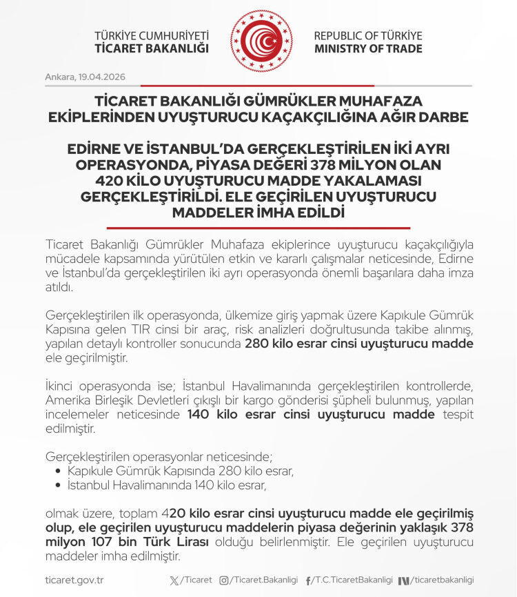 İlk operasyon, Kapıkule Gümrük Kapısında yapıldı. Burada, ülkemize giriş yapmak üzere gelen bir TIR, risk analizleri sonucu takibe alındı. Yapılan detaylı aramada 280 kilo esrar bulundu. İkinci operasyon ise İstanbul Havalimanında gerçekleşti. Amerika Birleşik Devletleri’nden gelen şüpheli bir kargo gönderisinde yapılan incelemede 140 kilo esrar tespit edildi. Olaylarla ilgili Edirne ve Gaziosmanpaşa Cumhuriyet Başsavcılıkları tarafından soruşturma başlatıldı.