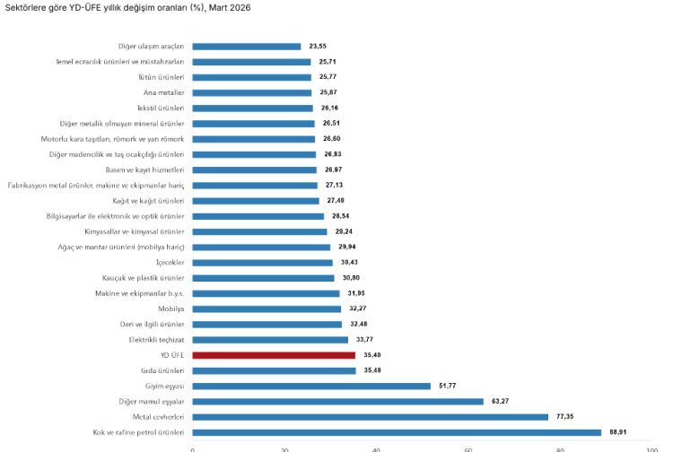 Sanayi sektörleri incelendiğinde yıllık bazda madencilik ve taş ocakçılığında yüzde 53,25, imalat sanayinde ise yüzde 35,10 artış yaşandı. İmalat ürünlerindeki fiyat yükselişi, genel endeks artışında belirleyici oldu.