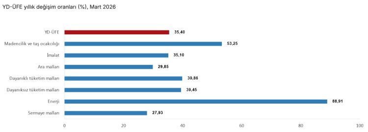 Türkiye İstatistik Kurumu (TÜİK) verilerine göre Yurt Dışı Üretici Fiyat Endeksi Mart ayında aylık %3,94, yıllık ise %35,40 yükseldi. En sert artış enerji grubunda görüldü.